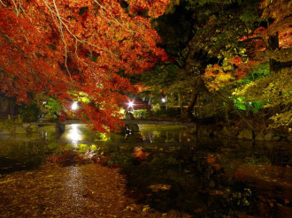 国の登録記念物、盛岡市指定保護庭園・景観重要建造物の「南昌荘」(盛岡市清水町)で11月12日、「紅葉の庭園ライトアップ」が始まった。