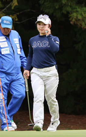 大王製紙エリエール・レディースオープン第1日。メルセデス・ランキング1位の佐久間朱莉(写真)と前週優勝の脇元華が65をマークして首位に並んだ=20日、愛媛・エリエールGC松山 【時事通信社】