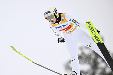 ノルディックスキーのW杯ジャンプ女子・個人第4戦。丸山希は122.5メートルと129メートルを飛び、合計244.4点で2位だった。W杯初勝利を挙げた開幕戦からの4連勝を逃した=30日、スウェーデン 【EPA時事】