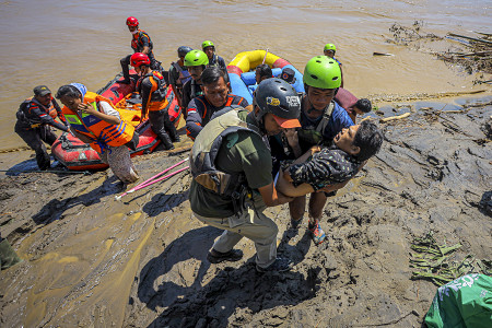 インドネシア国家災害対策庁によると、同国西部スマトラ島で24日から続いた豪雨による死者数が442人となった。依然として数百人が行方不明となっている。写真は被災した住民を救出する救急隊員=29日 【AFP時事】