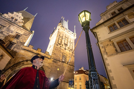 16日、プラハの観光名所カレル橋で、19世紀の制服姿でガス灯を点火する男性。クリスマスシーズンになると毎日夕暮れ時に手作業でともされる。1847年にお目見えし、現在も46基が街を照らしている。 【EPA時事】