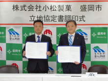 立地協定書調印式には、小松製菓社長の小松豊さんと内館茂盛岡市長のほか関係者が出席。小松さんと内館市長が協定書に署名した。内館市長は「盛岡地域の雇用拡大や産業の活性につながり、観光面の充実としても心強く思う。市としても人材確保や域内事業者とのネットワーク構築などのサポートをしたいと考えている。いずれ、盛岡の土産品も作ってもらいたい」と期待を寄せる。