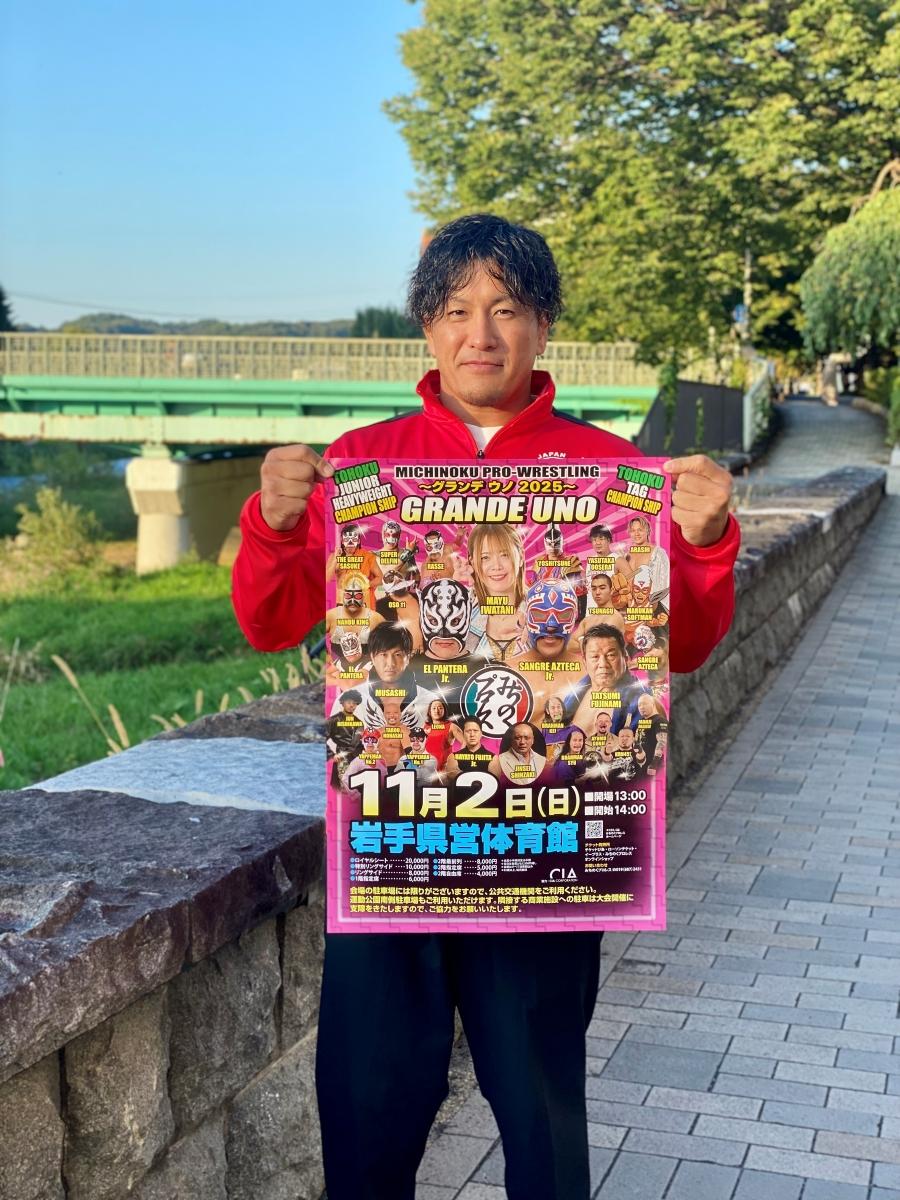 全日本プロレス所属で滝沢市出身のMUSASHI選手が、11月2日に岩手県営体育館(盛岡市青山)で行われる「みちのくプロレス(以下、みちプロ)」の大会「GRANDE UNO~グランデ・ウノ2025」に出場する。