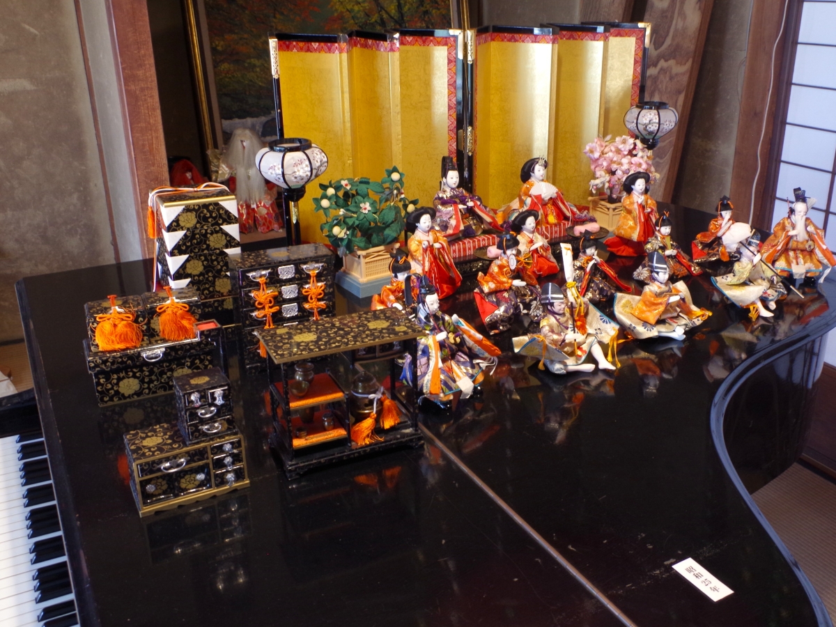 第2会場でピアノの上に並ぶひな人形