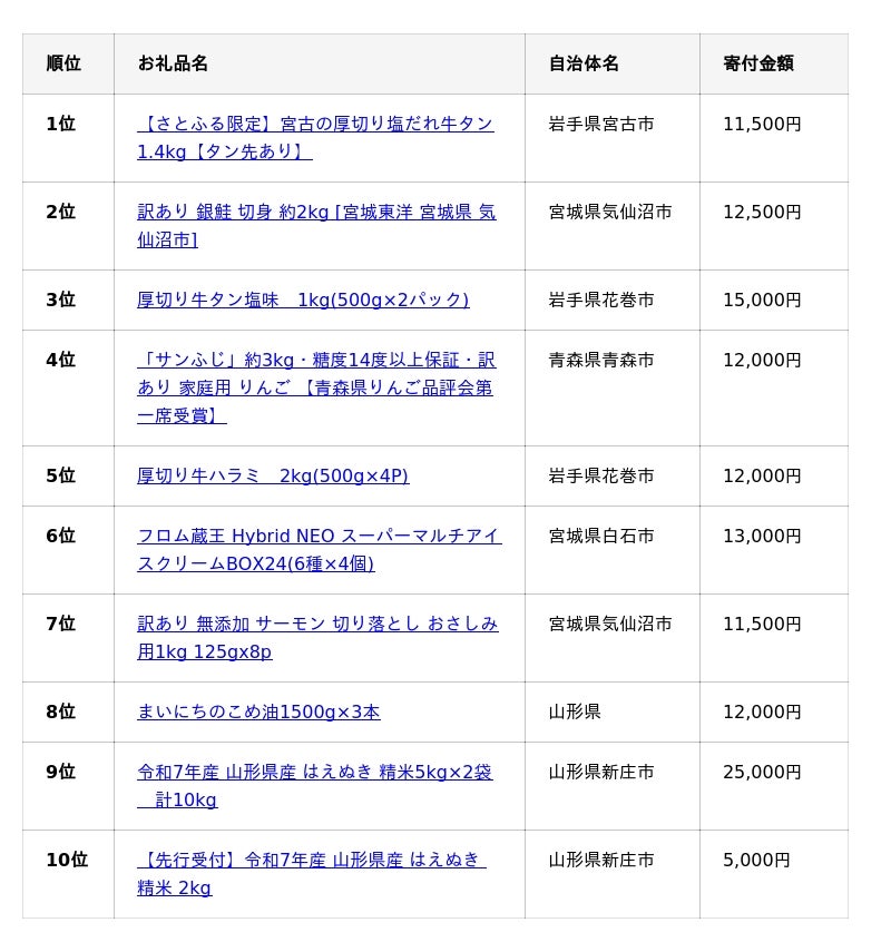 <東北版>2025年ふるさと納税人気お礼品ランキング(速報)詳細は以下よりご確認ください。