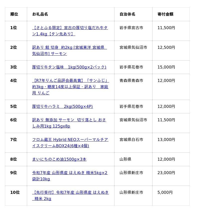 ■<東北版>2025年ふるさと納税人気お礼品ランキング(確定)