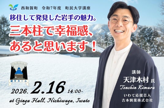 西和賀町教育委員会(岩手県西和賀町)は、令和8年2月16日(月)、西和賀町文化創造館「銀河ホール」にて、令和7年度町民大学講座として、吉本興業所属のタレント・天津木村氏を講師に迎えた講演会を開催します。