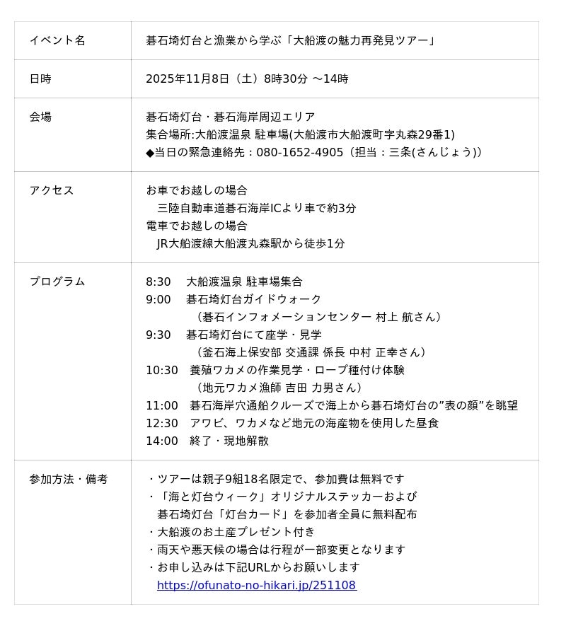 碁石埼灯台利活用コンソーシアムは、2025年11月8日(土)に碁石埼灯台と漁業から学ぶ「大船渡の魅力再発見ツアー」を開催いたします。このイベントは、日本財団「海と日本プロジェクト」の一環として、灯台を中心に地域の海の記憶を掘り起こし、地域と地域、異分野と異業種、日本と世界をつなぎ、新たな海洋体験を創造していく「海と灯台プロジェクト」の助成を受けて実施します。