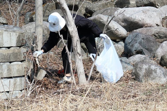 風で飛んできたであろうビニール袋片の他に、ポイ捨てと思われる空き缶や瓶、たばこの吸い殻など。用意されていたごみ袋はあっという間にいっぱいになってしまいました。