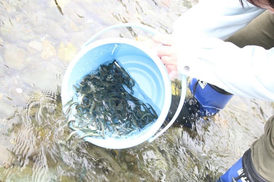 鮭のベイビー達をバケツで優しく川に流すと、あっという間に姿が見えなくなるまで泳いでいってしまいます。回帰率を向上させるために、体長およそ6センチ重さ2グラムと、ある程度の大きさまで育ててから放流するそうです。