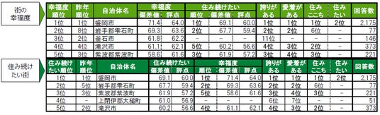 街の幸福度の1位は4年連続で盛岡市。2位は昨年8位から順位を上げた岩手郡雫石町。3位釜石市。