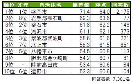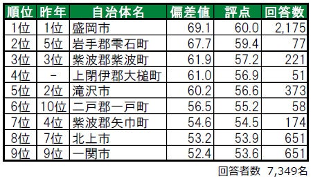 盛岡市が唯一偏差値70台の高い評価を得て、4年連続で1位に輝きました。盛岡市は、「住みここち」でも1位となっている街です。2位は岩手郡雫石町で、昨年8位から順位を上げました。3位は、釜石市です。その他、昨年は偏差値50未満のため順位非公開だった8位の胆沢郡金ケ崎町(いさわぐん かねがさきちょう)と9位の陸前高田市が今回トップ10入りしています。