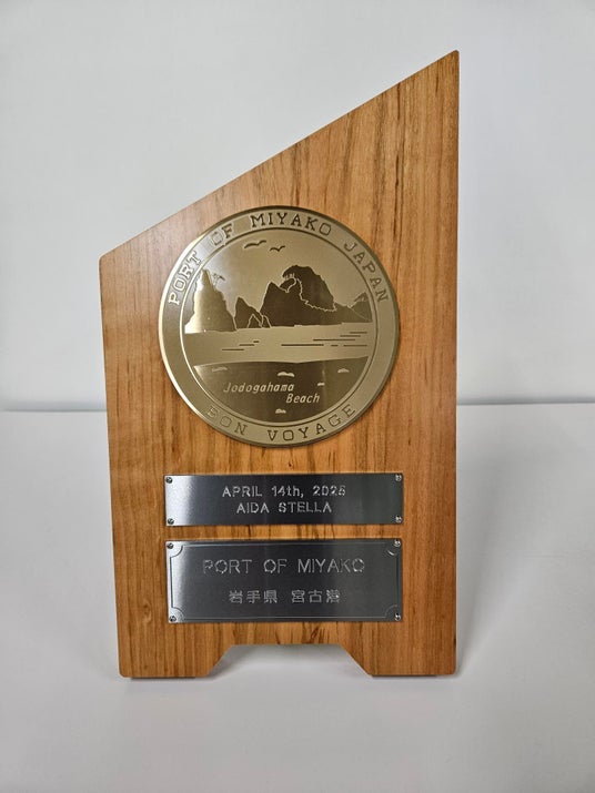パンチ工業株式会社 宮古工場(岩手県)では、自治体より宮古港に初入港したクルーズ船に記念品として贈呈するプレートの作成を依頼されました。これまで部品以外の加工経験は多くありませんでしたが、新たな取組みとして受注。宮古市の有名な観光スポットである浄土ヶ浜をモチーフにしたプレートを作成しました。