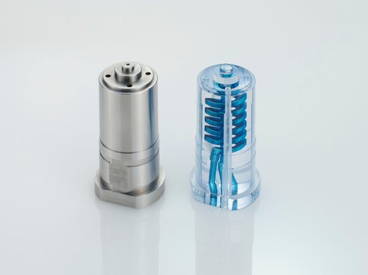 複雑形状の金属成形という分野では3Dプリンターによる金属粉末の積層が競合しますが、加工できる特殊鋼の種類が幅広い点、水管の内部を加工面が綺麗な切削加工ができるため錆などが出にくい点、原材料が汎用的な特殊鋼でコストが抑えられる点などに優位性があります。