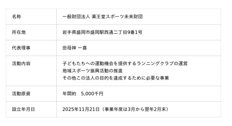 株式会社薬王堂は、寄附を通じて財団法人に資金提供を行い、財団法人はその資金を活用してランニングクラブの運営や地域スポーツ振興活動を推進してまいります。なお、ランニングクラブは2026年4月の活動開始を予定しており、体験会は2026年2月実施予定です。