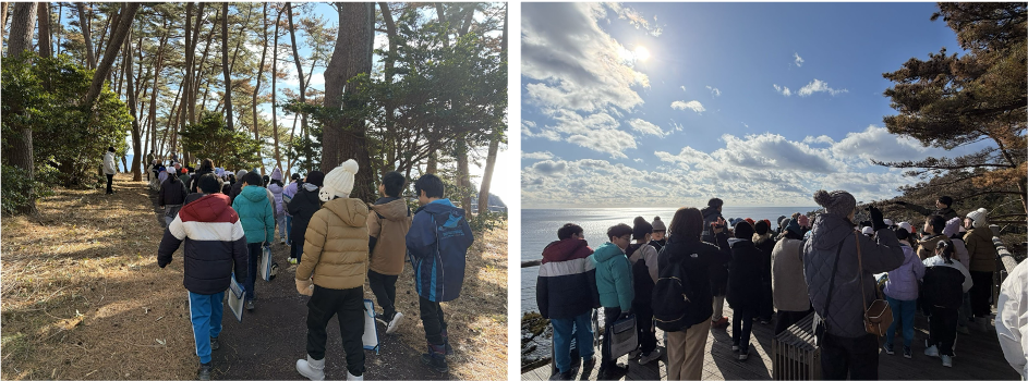 碁石海岸の地形や自然、海と人との関わりについて学びながら歩き、身近な海への理解を深めました。