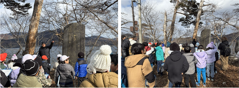 わかめ養殖発祥の碑では、地元わかめ漁師の吉田力男さんによる講話が行われました。大船渡の漁業の歩みや、地域の漁業を支えてきた“郷土の偉人”たちの功績について紹介され、児童たちは地域の歴史に触れました。