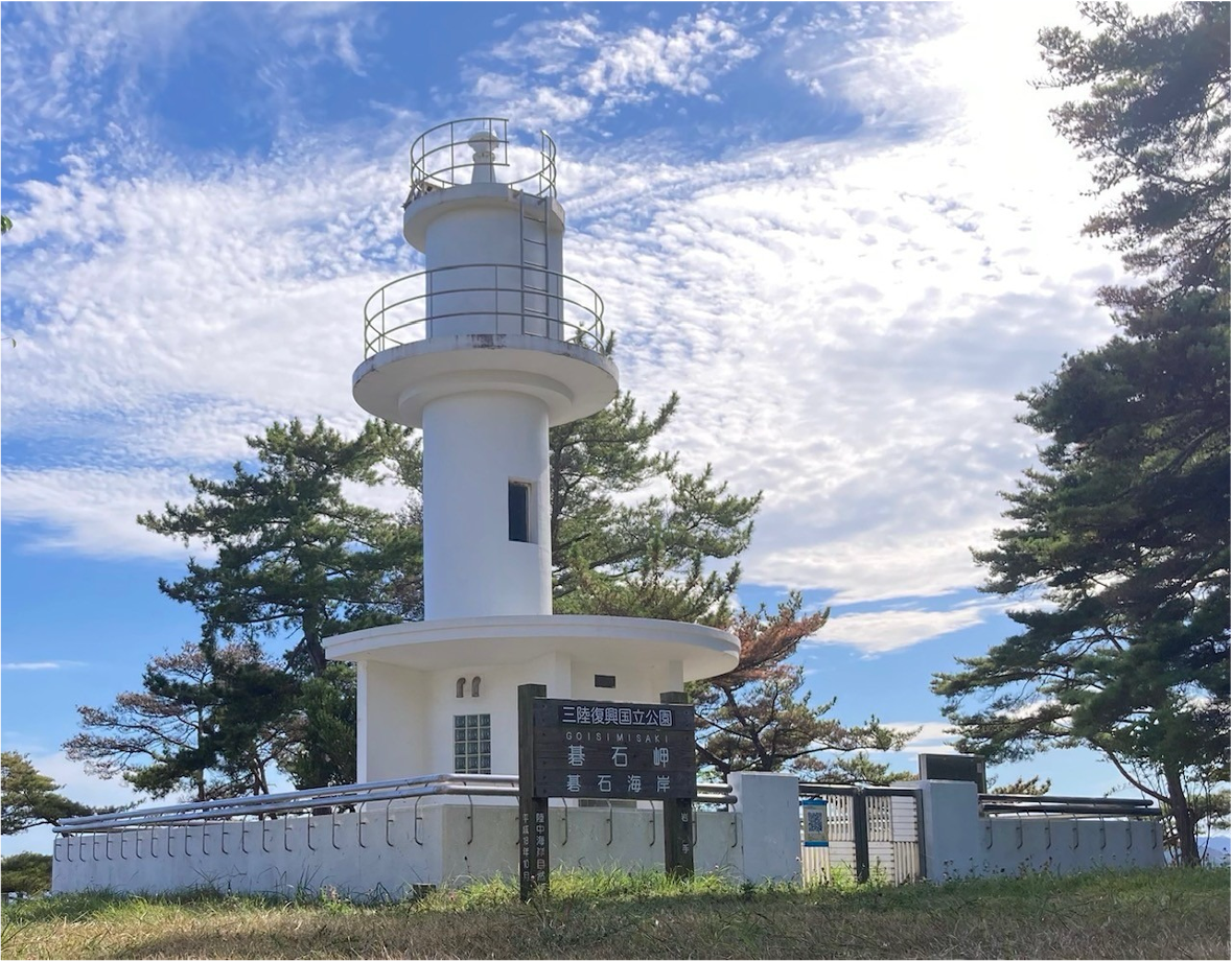 リアス式海岸の代表的な景勝地・碁石海岸の突端に建つ灯台。太平洋を望む断崖に位置し、沖を航行する船舶の安全を守る航路標識として設置されています。現在は周囲が公園として整備され、遊歩道から間近に灯台を眺められるほか、碁石海岸の奇岩や広大な海を一望できる展望スポットとして訪問客に親しまれています。