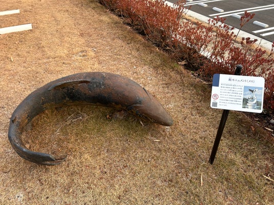 施設前に置かれた被災したブロンズ製の鮭のモニュメント。震災前は「鮭のシンボル塔」として2体ありましたが、現在はメスのみが残り、オスは行方不明となっています。