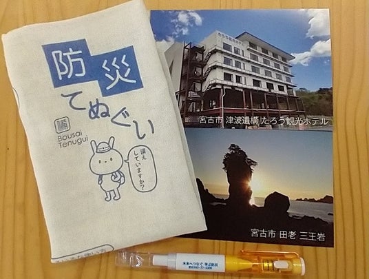 宿泊プラン特典の、防災手ぬぐいとホイッスル付きライトペン、フォトカードのセット。