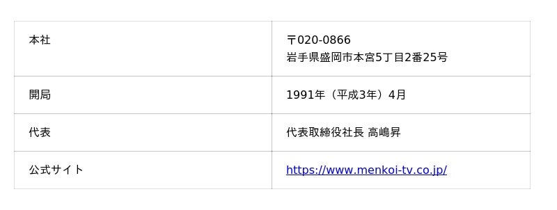 株式会社岩手めんこいテレビ(mit)は、岩手県を放送エリアとするテレビ放送局です。岩手県内のニュースを伝える「mit Live News」や来年で放送30年となる人気番組「山・海・漬」や、タレントの河合郁人さんがMCを務める生放送番組「サタデーファンキーズ」などを制作放送しています。