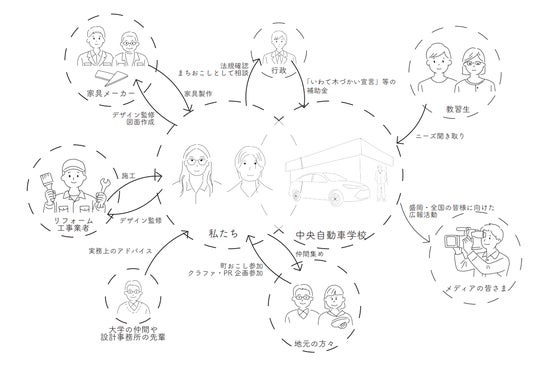 当校では、2025年11月に本プロジェクトのデザイン概要および施工計画の提案を受領し、プロジェクトの全体像を策定いたしました。本プロジェクトでは、地域住民の皆様と共にDIYやワークショップを実施することを検討しており、地域社会と協同することで新たな価値を創出してまいります。すでに、盛岡で活動するボランティア団体や地元の施工業者、地域の魅力の発信者の皆様と協議を重ねており、今後のワークショップ運営や広報活動において多大なるご協力をいただく体制を構築しております。